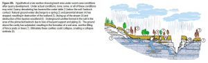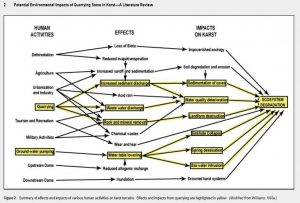 Quarrying may intersect active ground-water conduits, or cause their blockage, with adverse consequences for aquatic communities. Ground-water withdrawal and diversion of surface water may cause above ground and underground hydrologic systems to dry up. (pg 13)